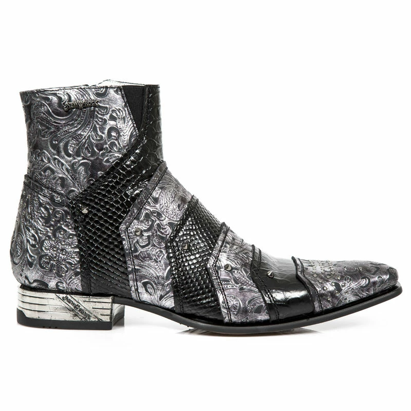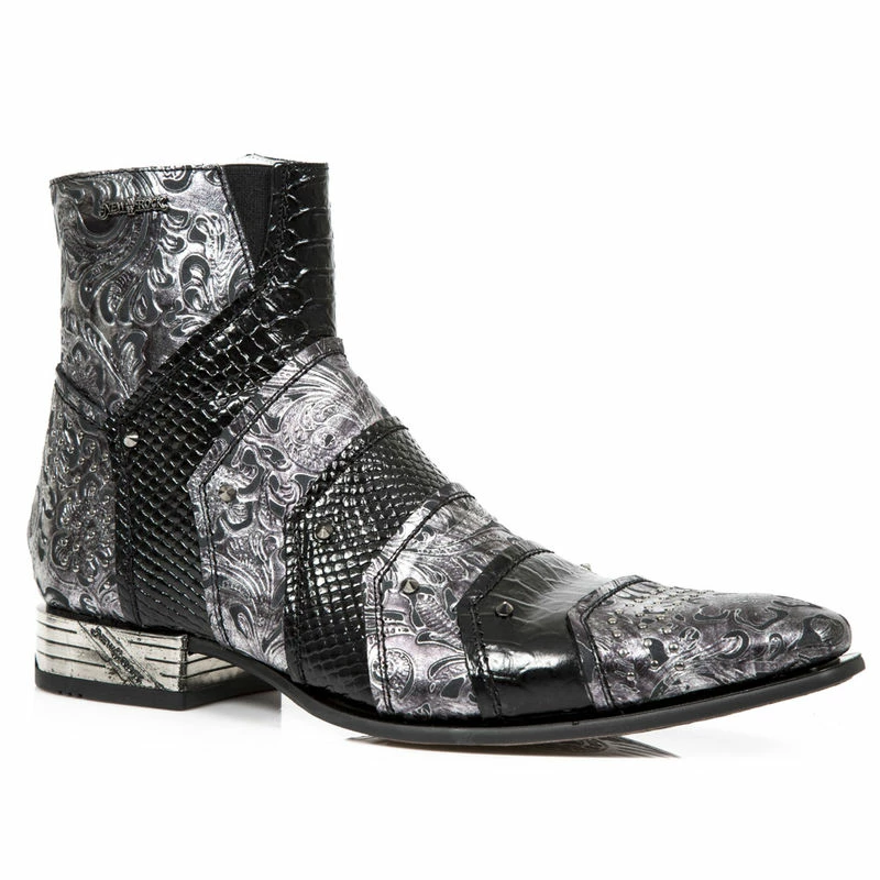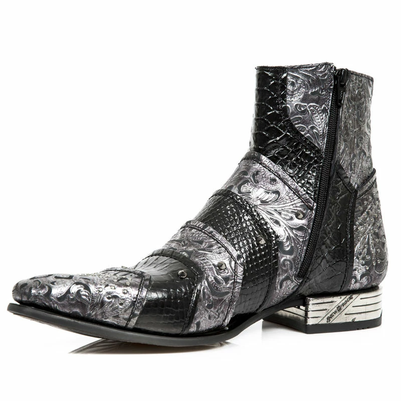 Bottines en cuir noir et gris avec décoration baroque et effet croco, vous aimez le vintage alors cette paire est pour vous!