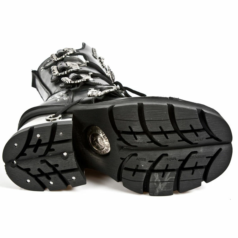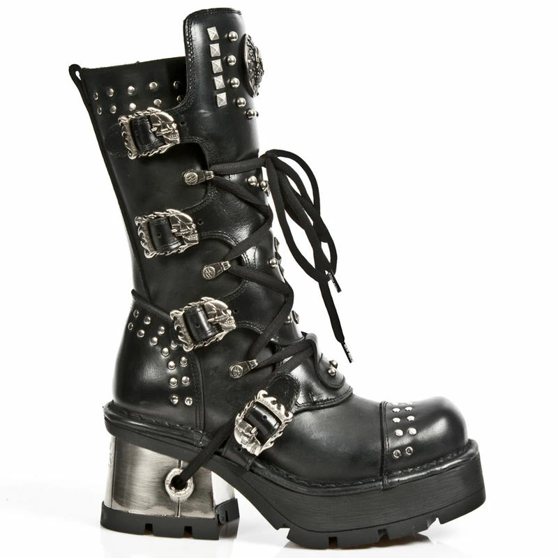 Bottes unisexe en cuir noir décorées de rivets métalliques, elles possèdent un large talon en métal, des sangles de réglage avec boucles en forme de skull et de clous pyramidales