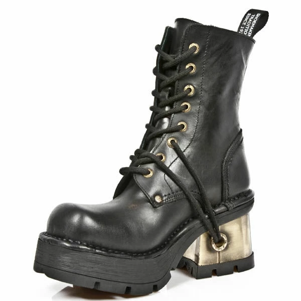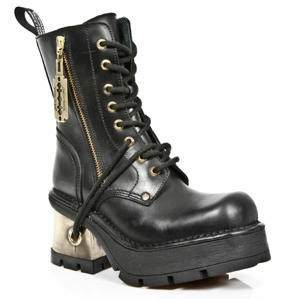 Superbes bottes à lacets New Rock en cuir noir. Une touche de doré est présente sur le talon entièrement en métal, emblème de la marque et gravé du nom de celle-ci, ainsi que sur les oeillets des lacets et sur la fermeture éclair du côté extérieur de la botte. Cette fermeture est agrémentée d’une petite plaque métallique en forme de lame de rasoir gravée du nom New Rock.