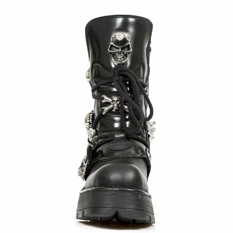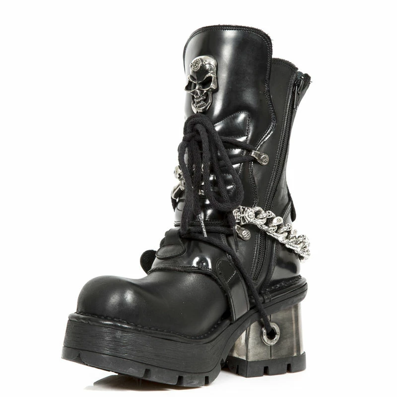 Vous voulez du goth pur et dur ? Alors que pensez-vous de ce modèle ? Boucles en forme de têtes de mort, larges talons métalliques, semelles compensées, gros skull frontal, chaîne de décoration à gros maillons: la totale pour cette paire de New rock M.1074-C1