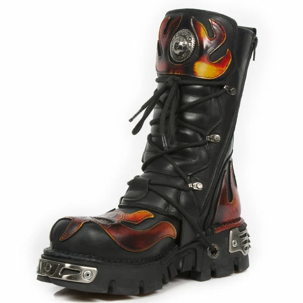 Ces bottes new rock sont une nouvelle version de la fameuse new rock n° 107 mais avec cette fois-ci des boucles métalliques démesurées en forme de skull, bien sûr le skull rouge est toujours présent sur l’avant de la botte