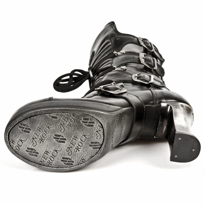 Ces bottes de style gothique possèdent 4 sangles réglables, une fermeture éclair intérieur, un laçage frontal et surtout un beau talon en métal !