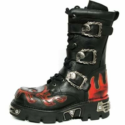 Cette paire de bottes en cuir new rock est dans la pure lignée de la marque, les fameuses semelles reactor sont là, les boucles spécifiques en forme de skull, les flammes rouges et le gros skull cousu sur l’avant, voilà de quoi ne pas passer inaperçu !