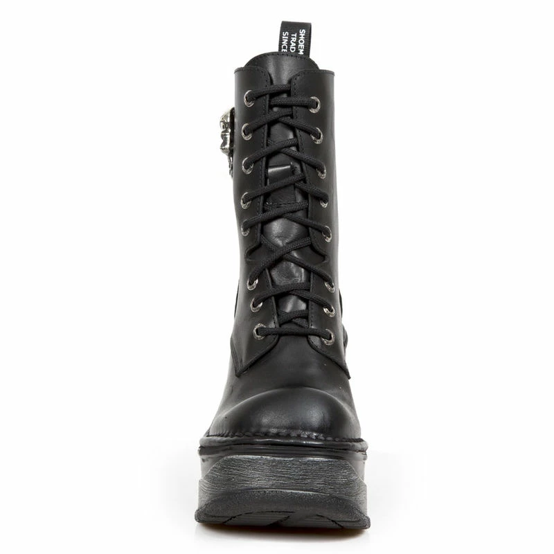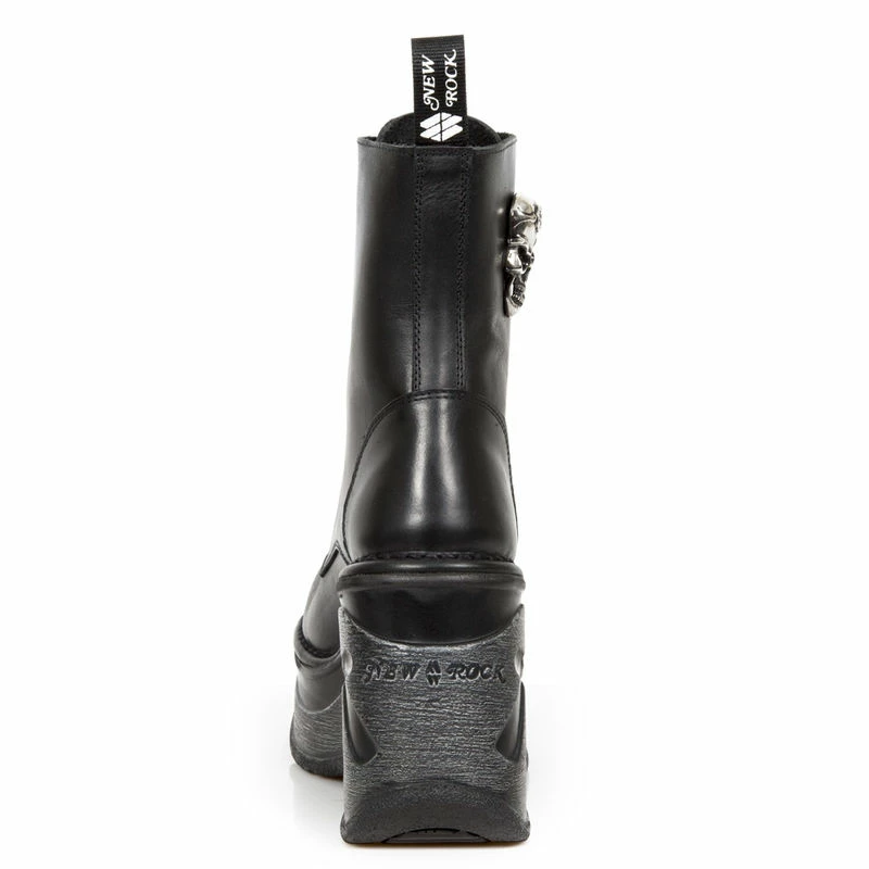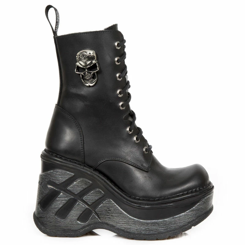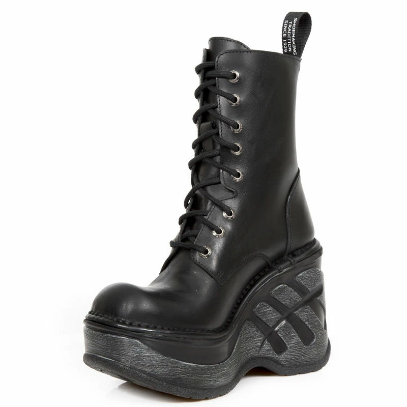 Cette belle paire de bottines en cuir noir de haute qualité possède des semelles compensées de plus de 5 cm de haut et 12 cm au talon