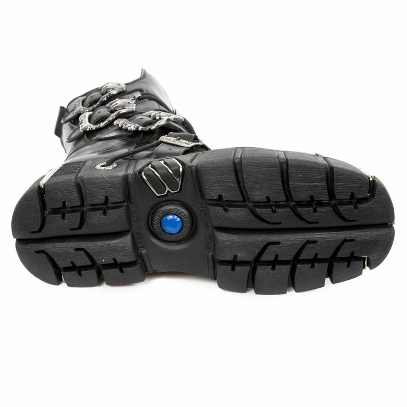 Bottines de pure style gothique comme sait si bien les faire New Rock avec quatre boucles de décoration dont trois ornées de têtes de mort , facile à enfiler avec sa fermeture éclair sur le côté .