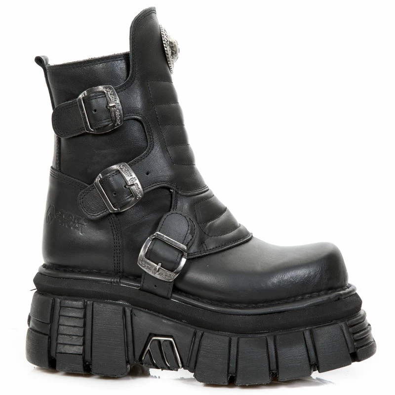 Bottines unisexe avec trois boucles de fermeture sur le côté extérieur, confortable avec sa semelle compensée de 5cm, stylé et goth, fabrication avec un cuir de qualité ce modèle de chez New Rock est un incontournable de la marque, vous trouverez le logo en métal ainsi qu’ un effet matelassé sur la languette à l’avant de la bottines.