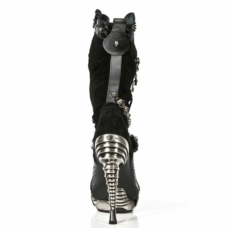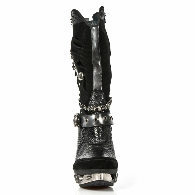 Grandes bottes en cuir noir bi-matière au style inimitable. Du talon en métal fuselé en forme de colonne vertébrale à l’effet croco sur le devant et le haut de la botte, en passant par la chaîne de têtes de mort métalliques, la sangle ornée d’une boucle en forme de crâne, l’effet déchiré et l’épingle à nourrice géante sur le côté extérieur ; tous les éléments de cette chaussure rassemblés font son originalité et son style incomparable. La marque New Rock est la référence absolue pour toutes celles et ceux qui aiment les looks décalés et hors du commun, tant rock que goth, punk ou encore biker !