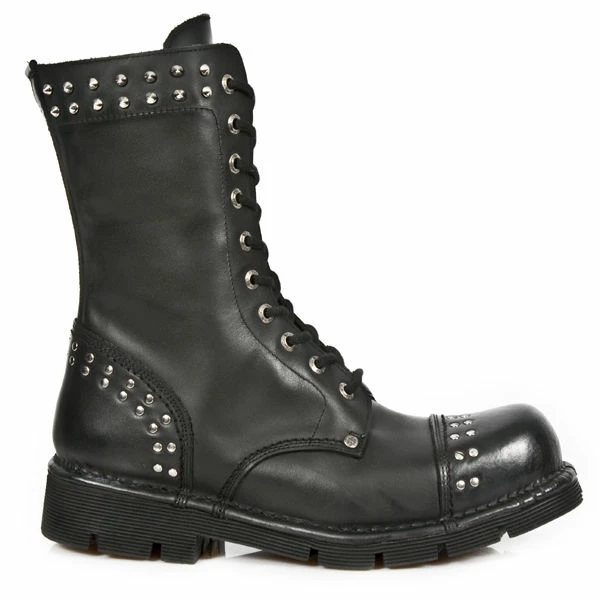 Bottines mixtes de chez New Rock en cuir noir de style rangers, elles seront données un genre à votre tenue avec ses spikes de décoration, fermeture par laçage sur l’avant.