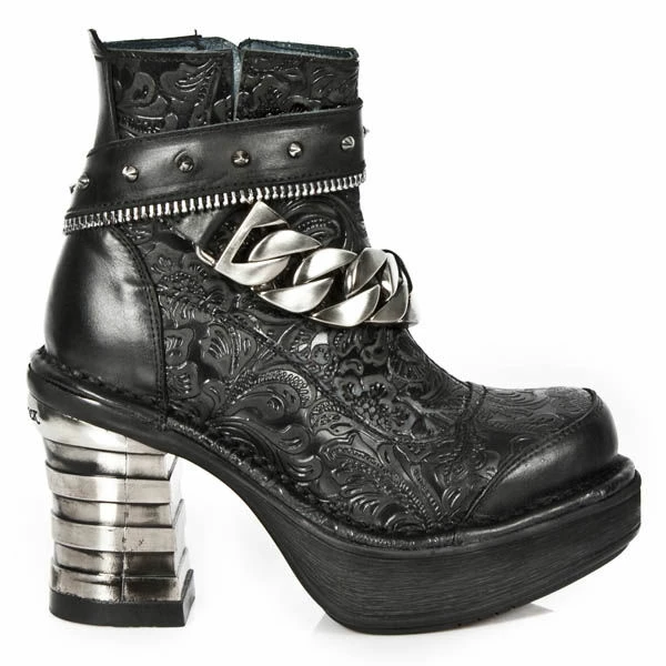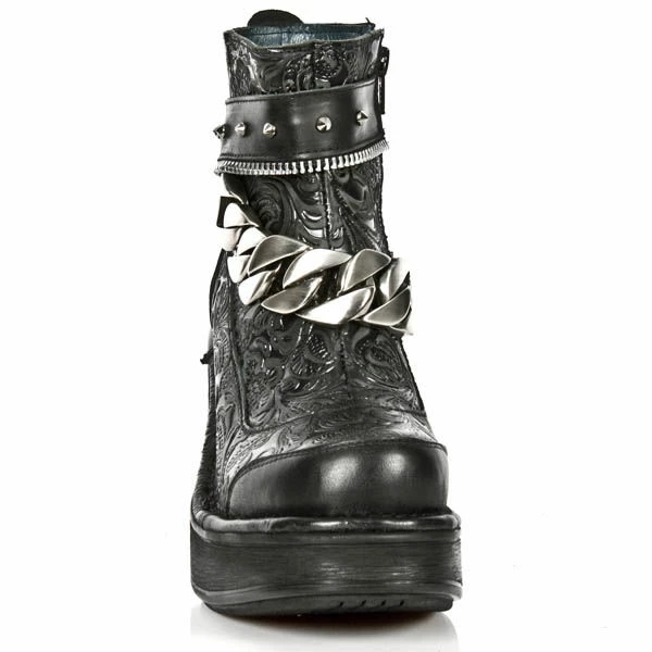 Bottines New-Rock en cuir , elles vous séduiront avec leur décoration baroque et le côté plus rock n’roll avec sa chaîne et sa bride effet fermeture éclair sur le devant orné de spikes , très original avec son talon en métal et sa semelle légèrement compensée, Mesdames il ne faut plus hésiter, il vous faut cette paire de bottines .