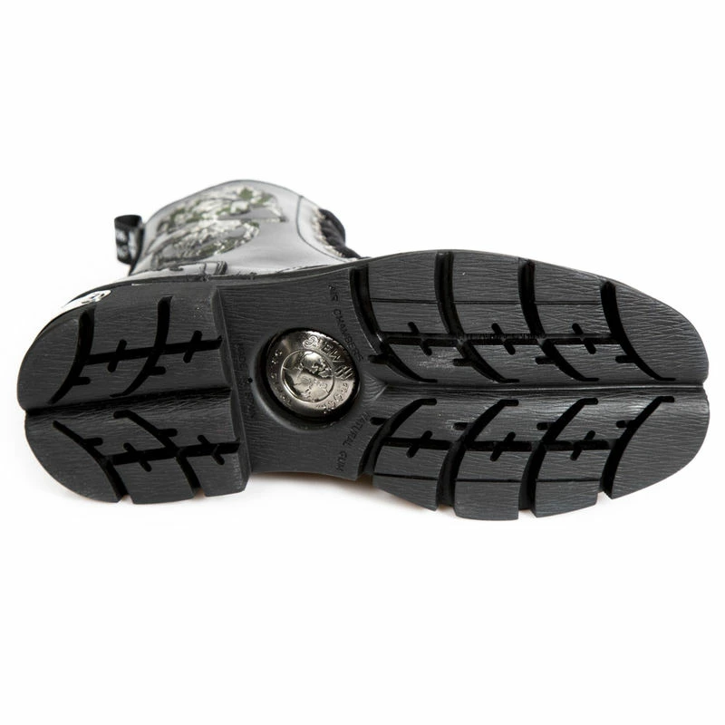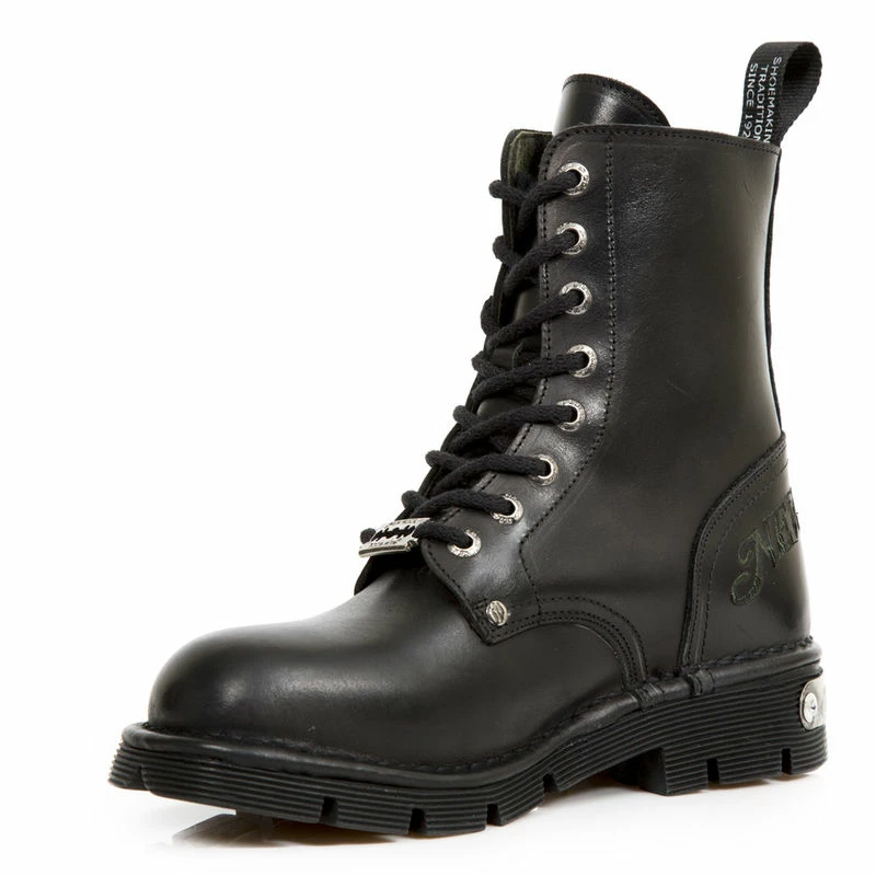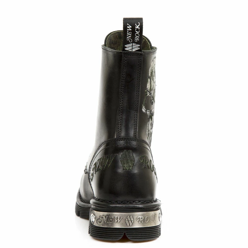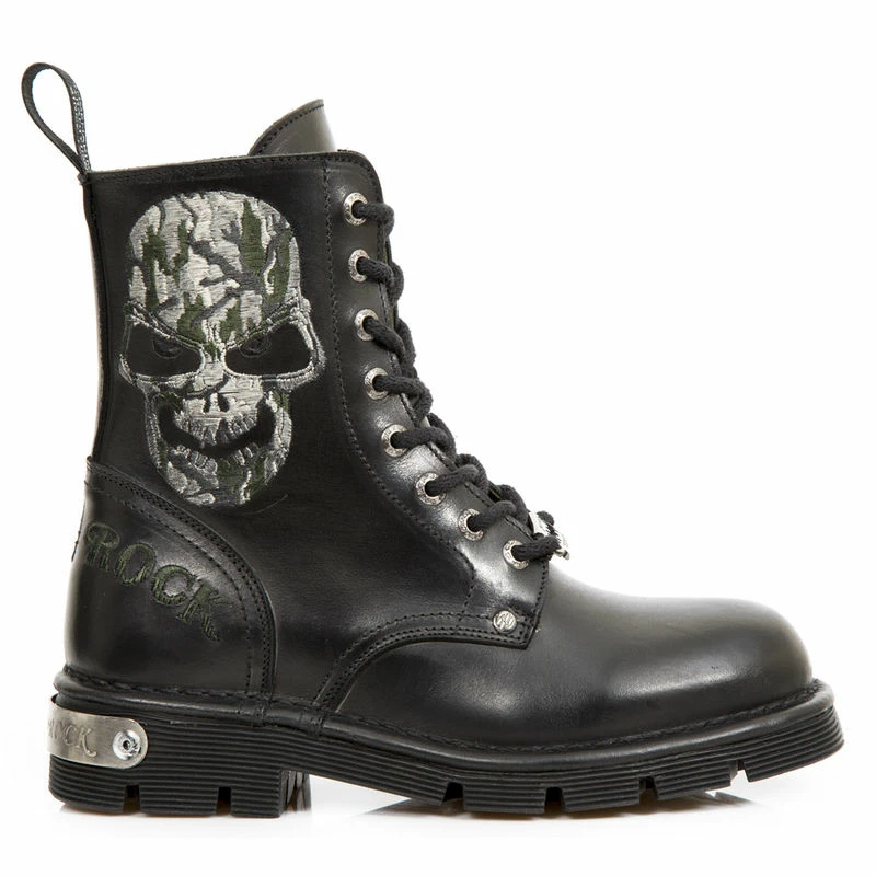 Bottines style rangers avec une tête de mort sur le coté de couleur kaki, vous trouverez aussi un marquage de couleur kaki sur l’arriére de la bottine, l’intérieur de la chaussure est de style camouflage, fermeture sur l’avant avec un lacet qui a pour déco sur le bas du laçage une plaque lame de rasoir, qualité, look, confort voilà les mots qui viennent en premier quand on parle de new-rock, sur le haut de la semelle vous trouverez une plaque en métal, bottines mixtes