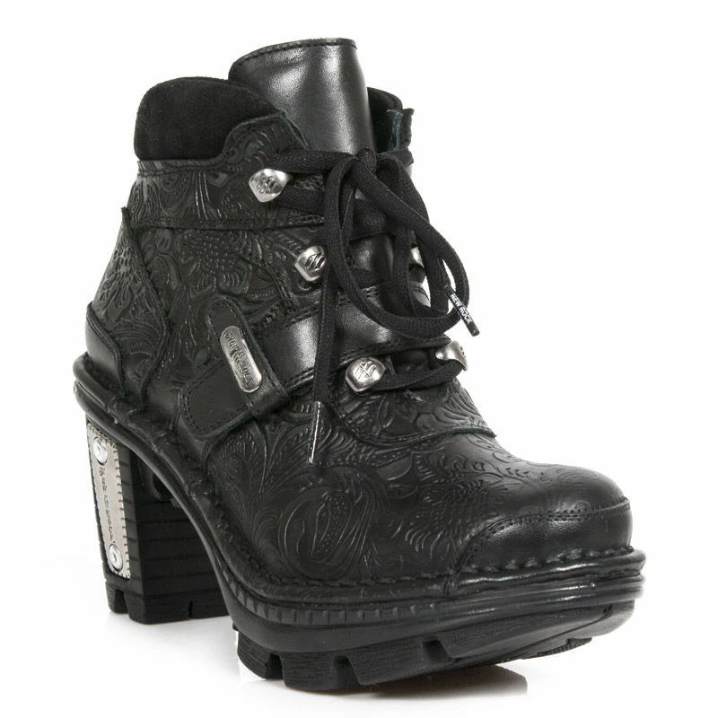 Magnifiques bottines style low boots en cuir noir à motifs fleuris, effet baroque garanti. Elles sont ornées d’une sangle en cuir lisse noir et de lacets, avec quelques petites touches de métal, symbole de la marque. On retrouve cette touche métallique sur la plaque fixée sur le flan du talon. Le tour de la cheville en daim noir ajoute une touche d’originalité supplémentaire à cette chaussure unique.