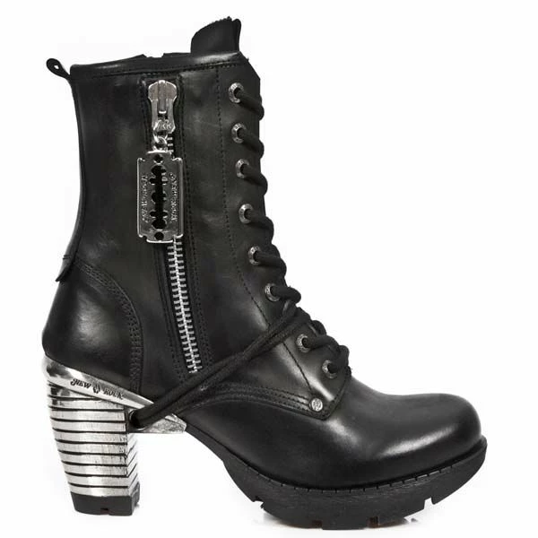 Magnifiques bottines à lacets entièrement faites de cuir, agrémentées d’une fermeture éclair factice sur le côté extérieur de la chaussure dont la tirette métallique est en forme de lame de rasoir. Une réelle fermeture éclair est cependant présente sur le côté intérieur de la botte afin de vous permettre de les enfiler sans défaire les lacets, gain de temps garanti ! New Rock a pour habitude de signer ses créations avec un talonb en métal unique en son genre, ce qui contribue à l’originalité de tous leurs modèles.