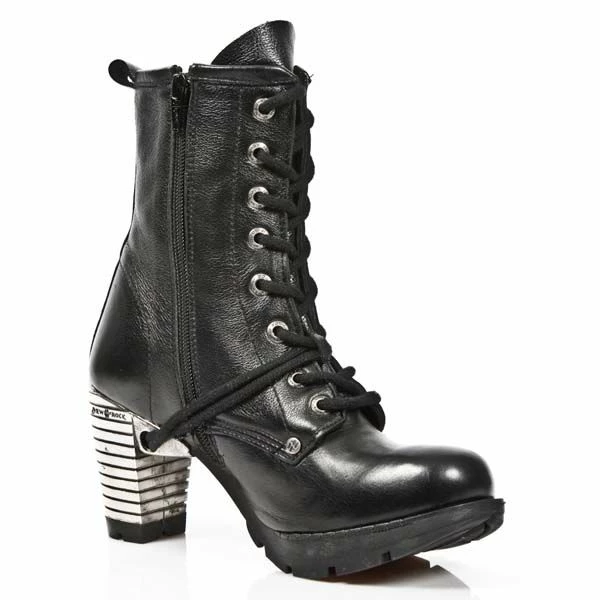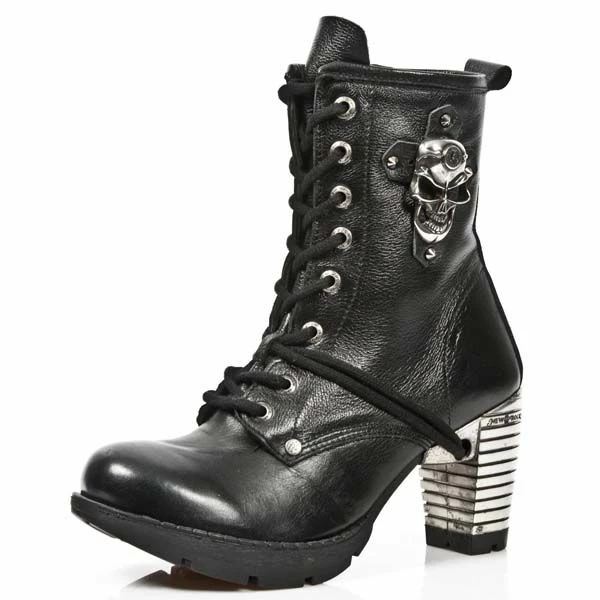 Bottines femme en cuir avec fermeture éclair sur le coté et laçage sur le devant de la bottine , décoré d’une croix et quatre rivets aux extrémités de celle-ci , sur cette croix vous trouverez une tête de mort avec le logo New-Rock, talon métallique qui donne un coté goth rock à ce modèle, vous pourrez les porter en jupe ou en pantalon, en journée ou en soirée .
