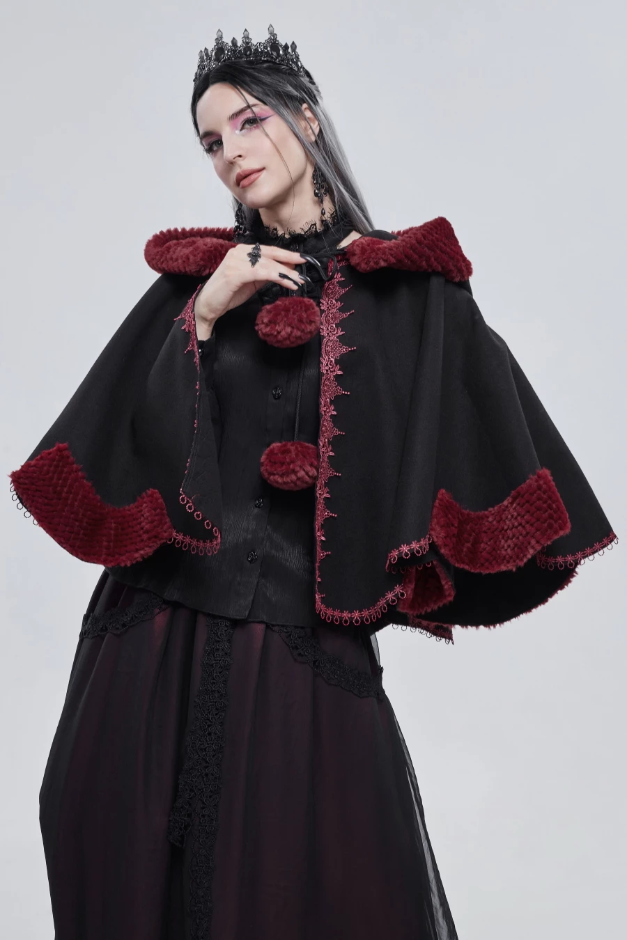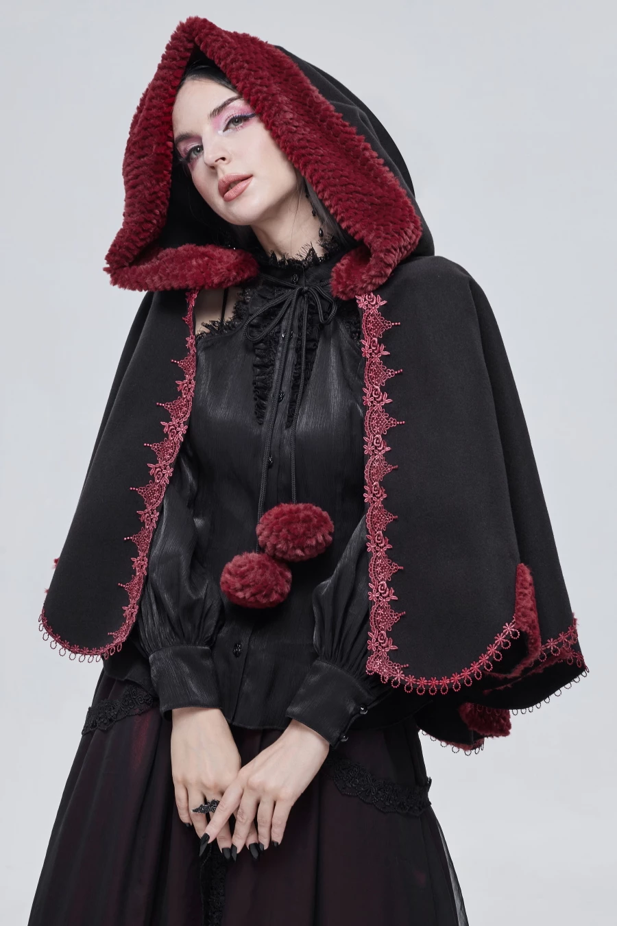 Fausse fourrure rouge en bordure de capuche et au bas de la cape