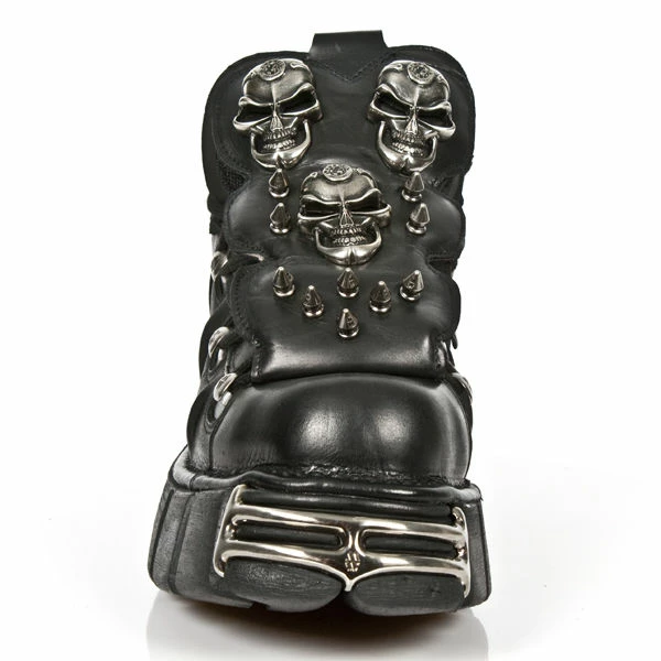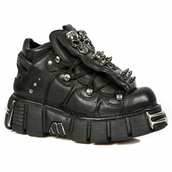 Chaussures unisexe en cuir noir à semelles compensées, elles sont décorées de gros skulls sur la languette pour un look d’enfer