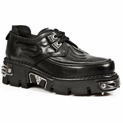 Belle paire de chaussures en cuir noir décorée de flammes ton sur ton, elle possèdes les semelles reator avec des fers métalliques