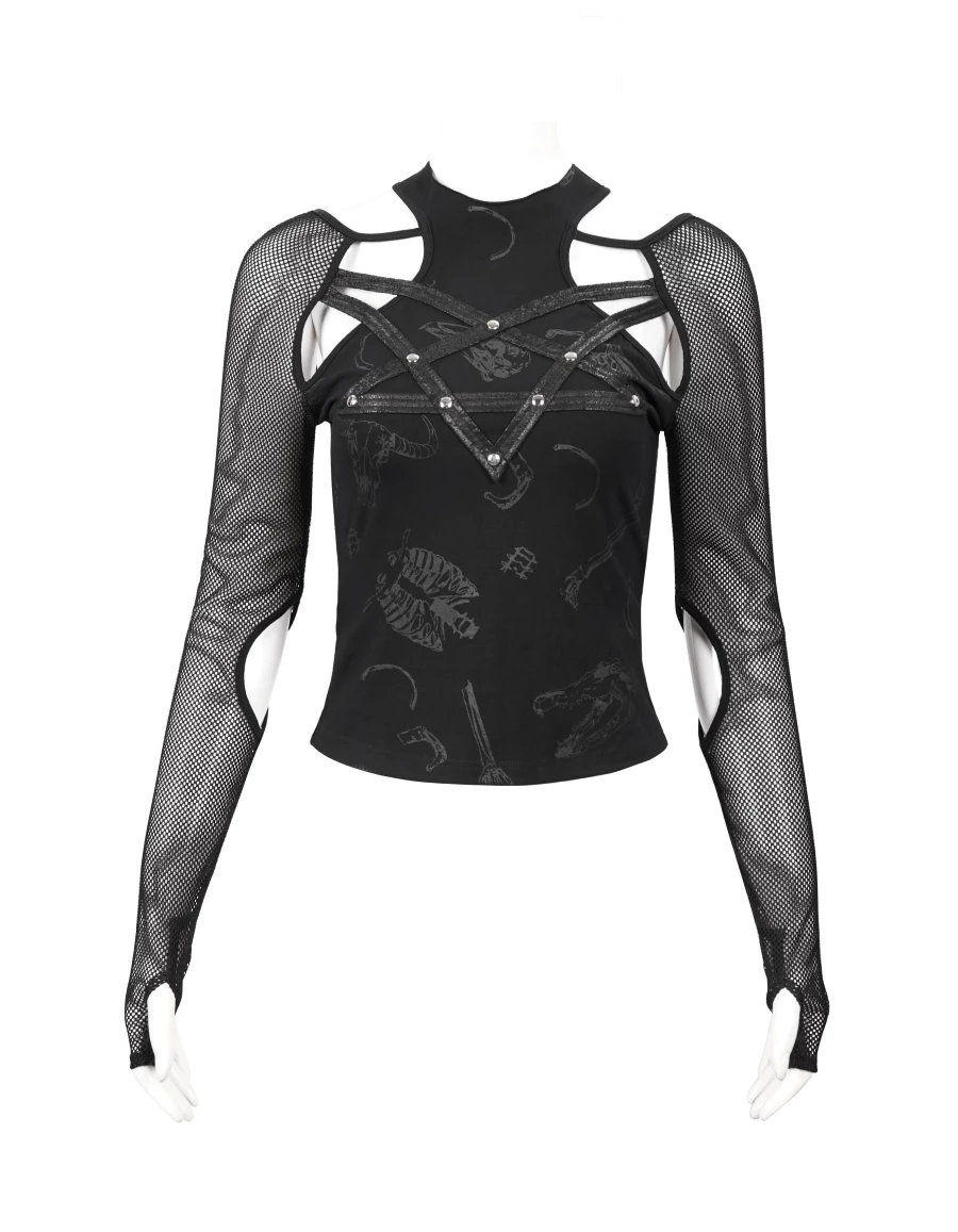 Il possède des manches en tissu résille à grosses mailles (tissu filet) avec une découpe au niveau des coudes et le passage pour le pouce et l’index