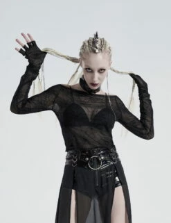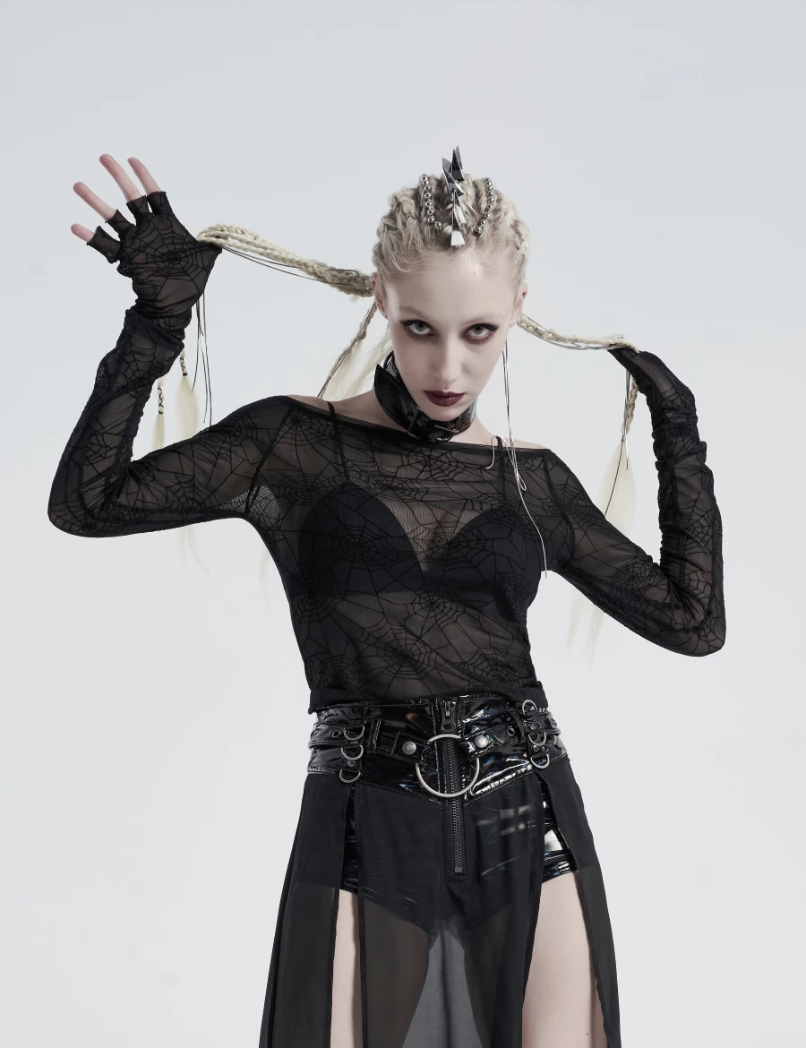 Dans un pur style gothique ce haut en tissu résille est décoré de toiles d’araignées