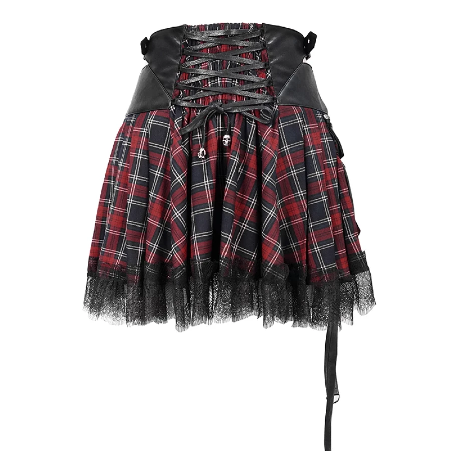 Très belle jupe plissée en tissu tartan et simili cuir noir