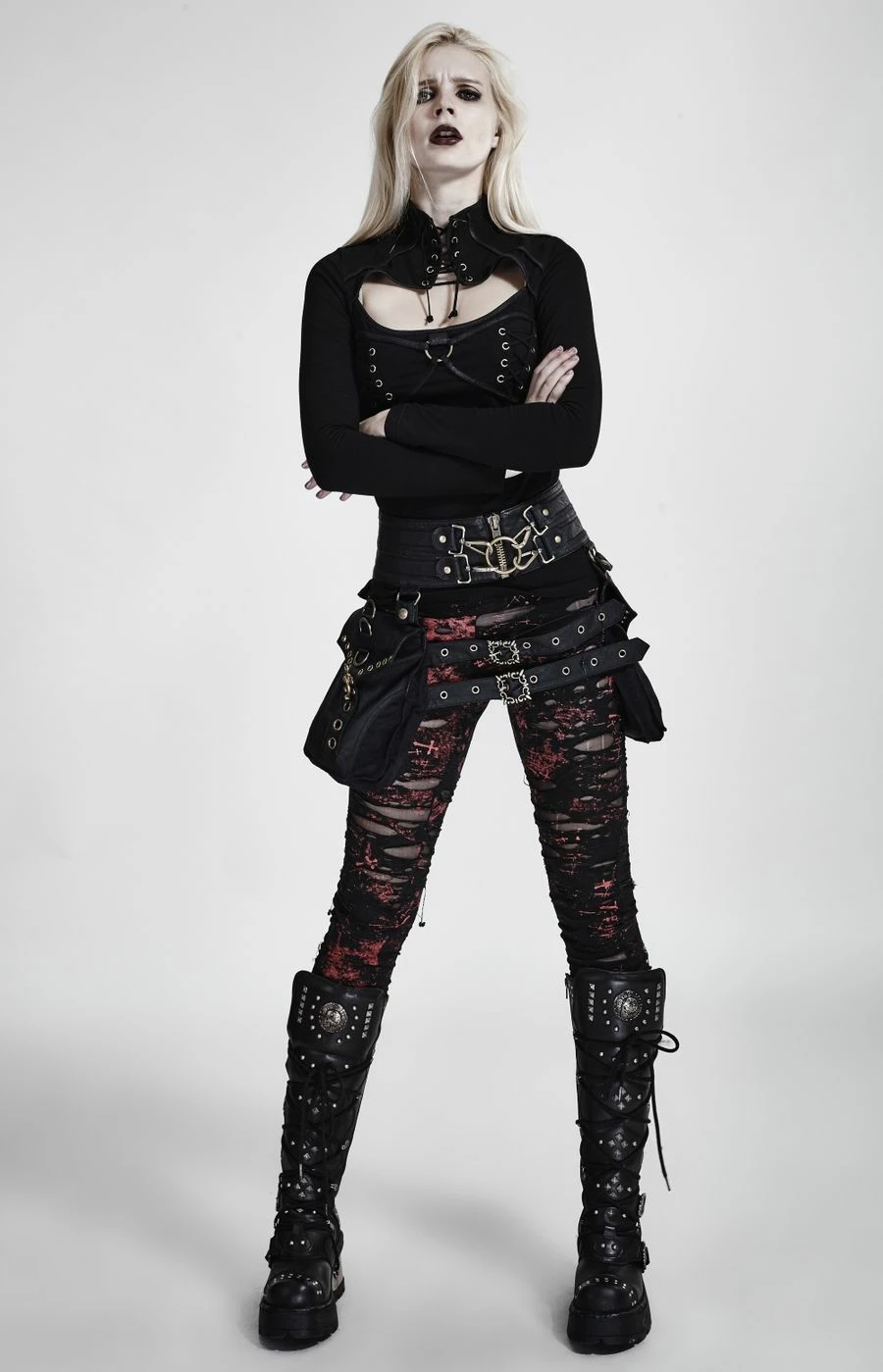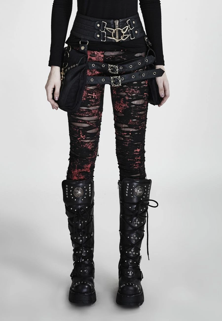 Look destroy pour ce leggings noir et rouge aux nombreux effets déchirés, un tulle très fin permet de ne pas avoir la, peau directement au contact du froid