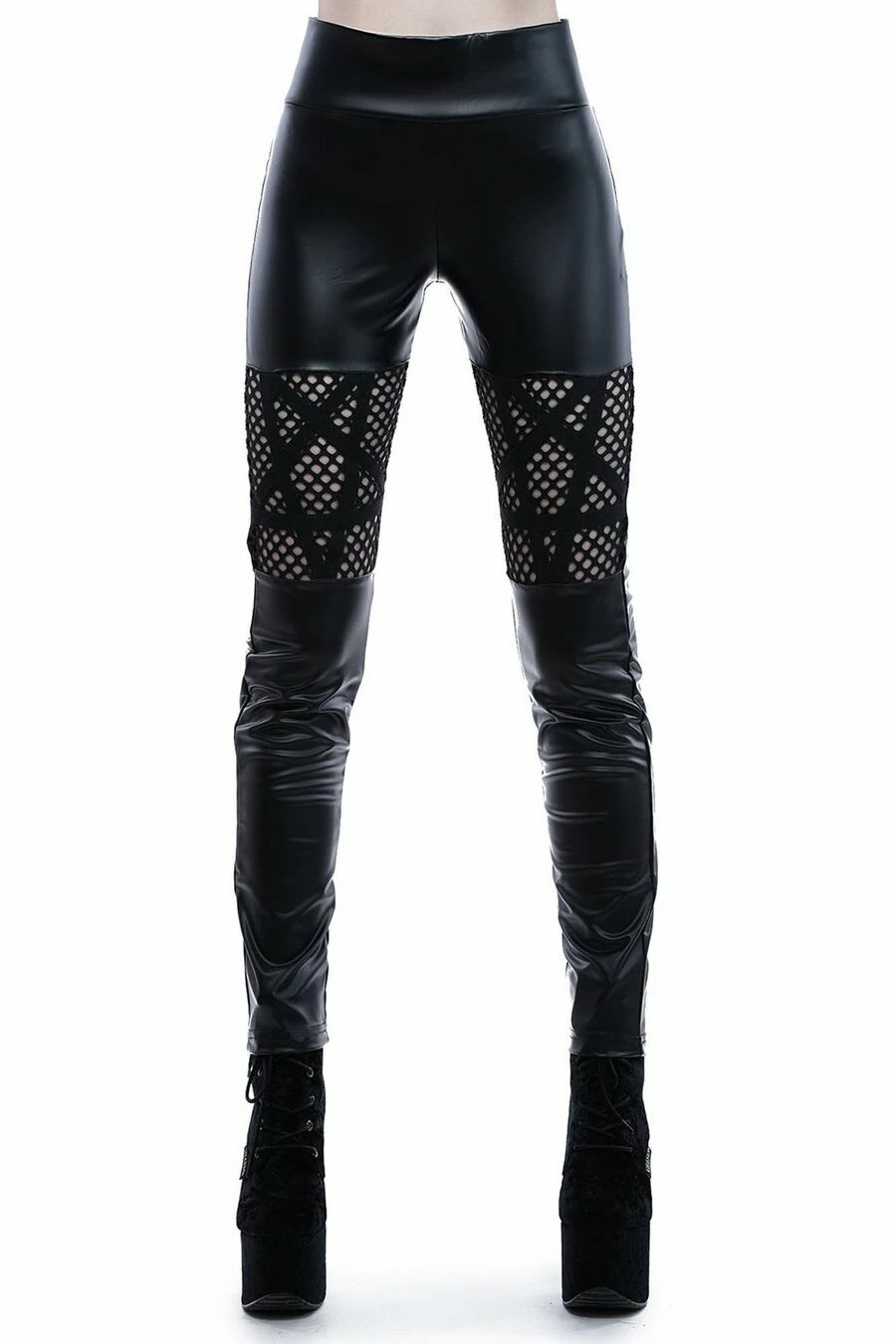 Le leggings Killstar « Witchnet » de coupe classique reste simple avec un tissu en similicuir ultra-extensible et des empiècements en résille grosses mailles et des grands pentagrammes
