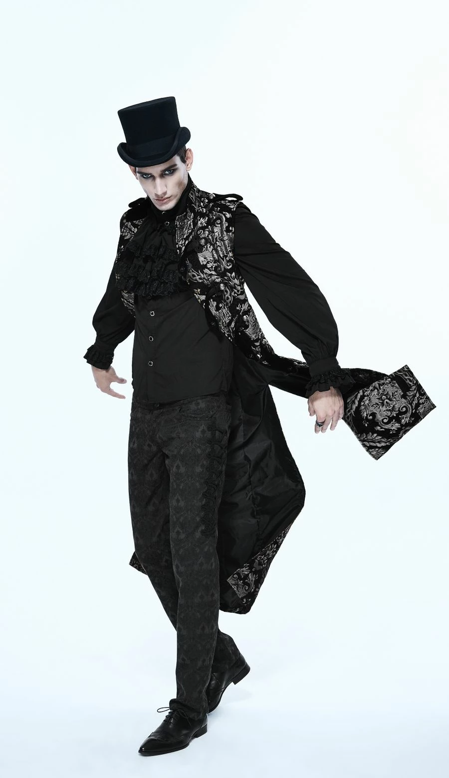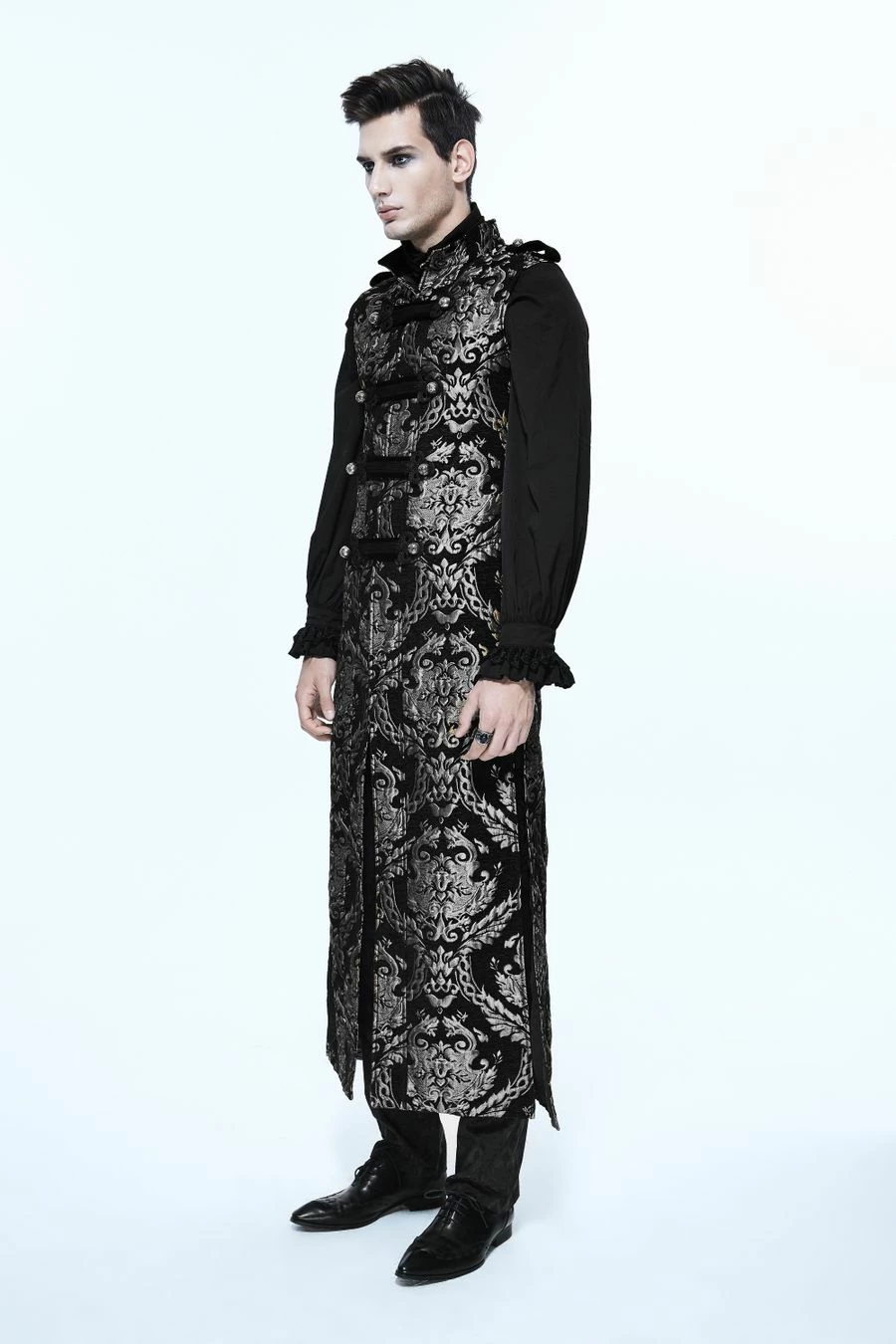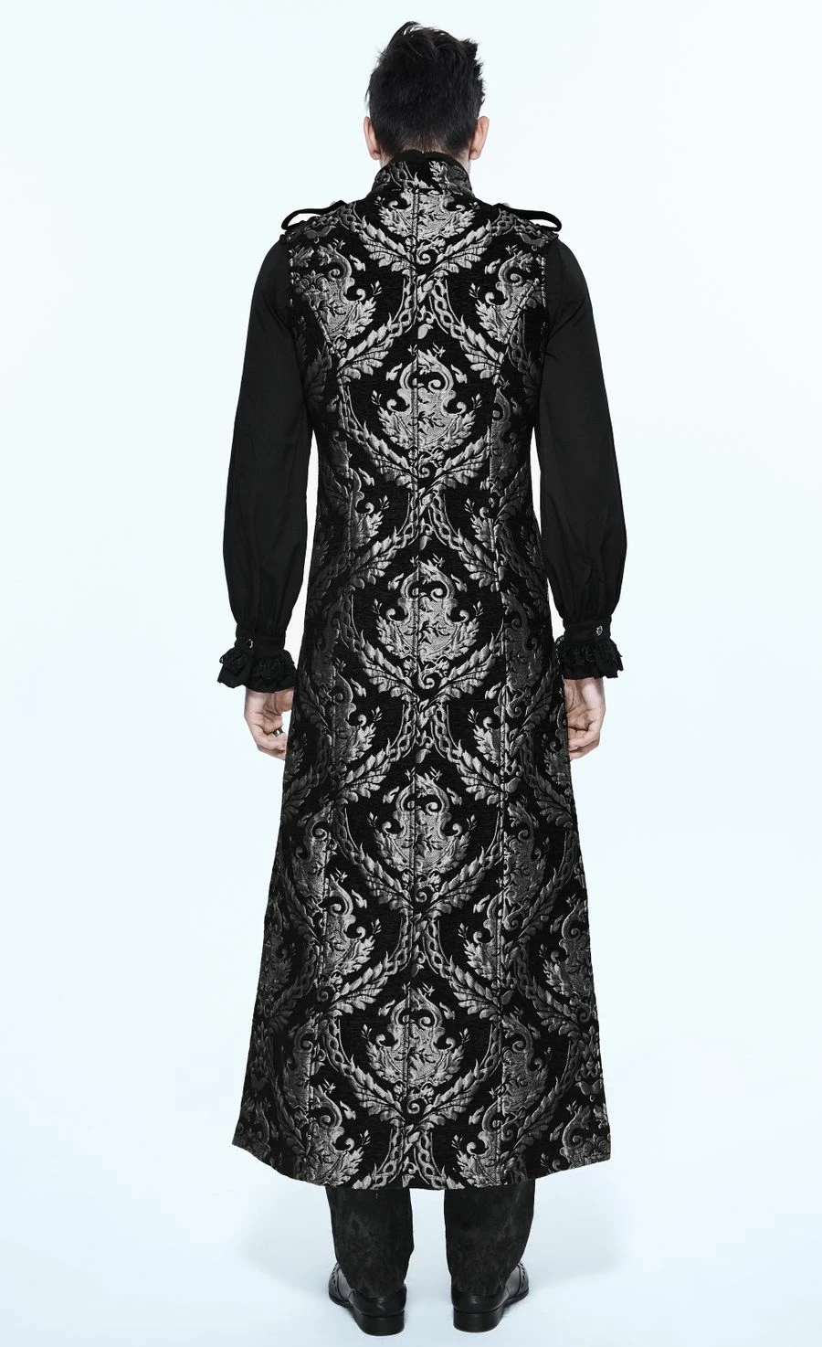 Longue veste gothique sans manches de style royaliste déclinée dans un très beau tissu épais, elle est entièrement décorée de somptueux motifs baroques gris argentés