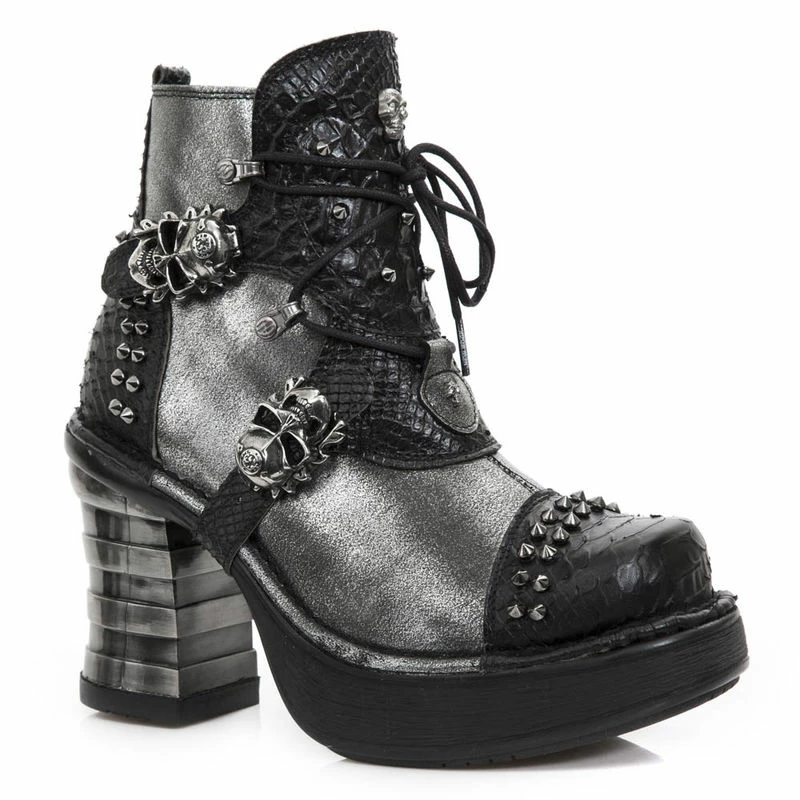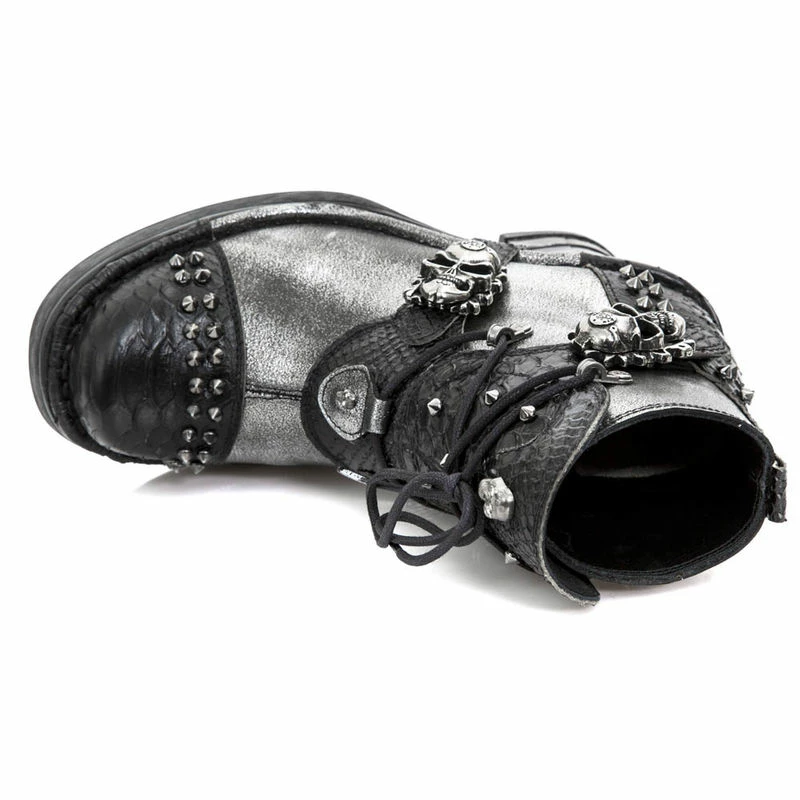 Superbes bottines New Rock à talons et cuir bi-matière. Un cuir lisse gris métallisé/chrome associé à un cuir noir brillant à effet peau de serpent. Le tout est en plus agrémenté de clous et de crânes en métal qui font office de boucles. On retrouve cette touche de métal dans le talon, typique de la marque New Rock. Avec ces bottines, c’est un look hors normes assuré !