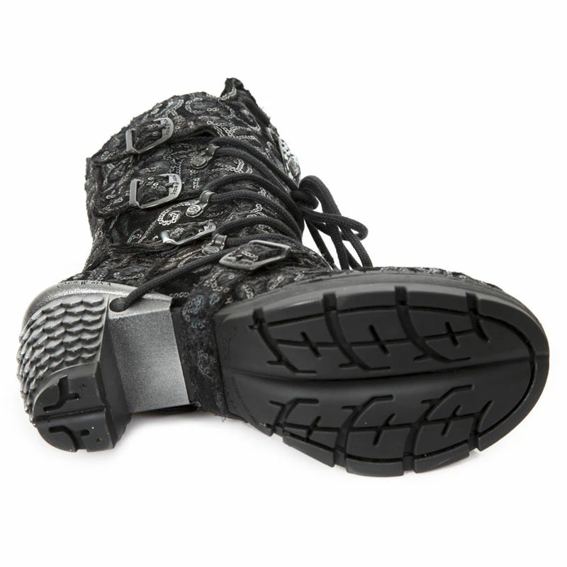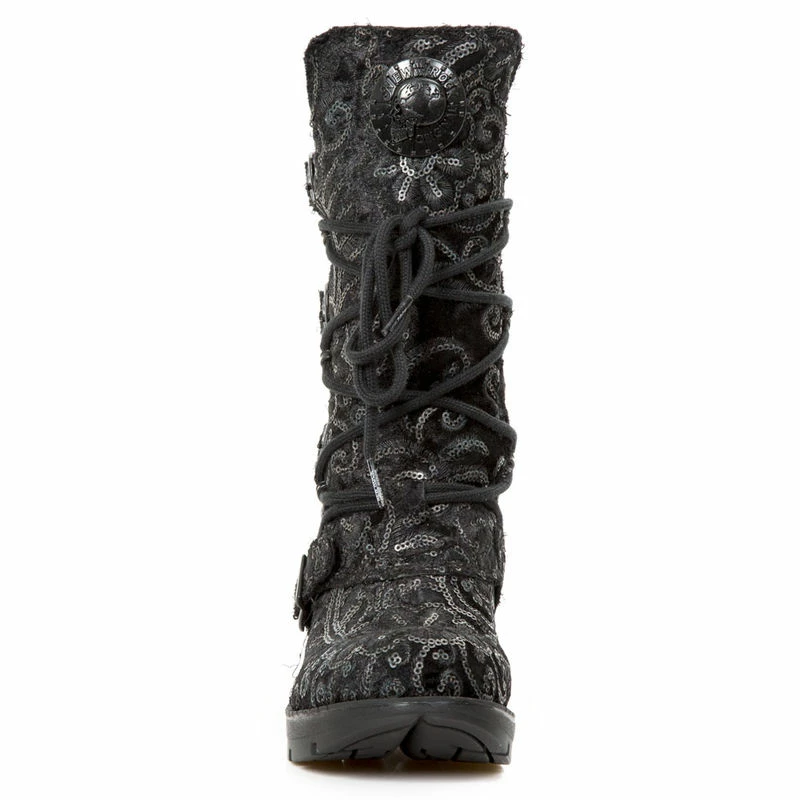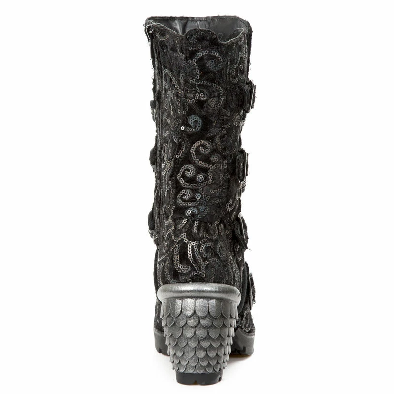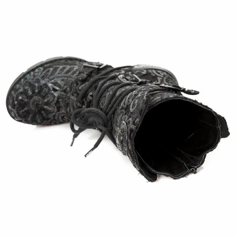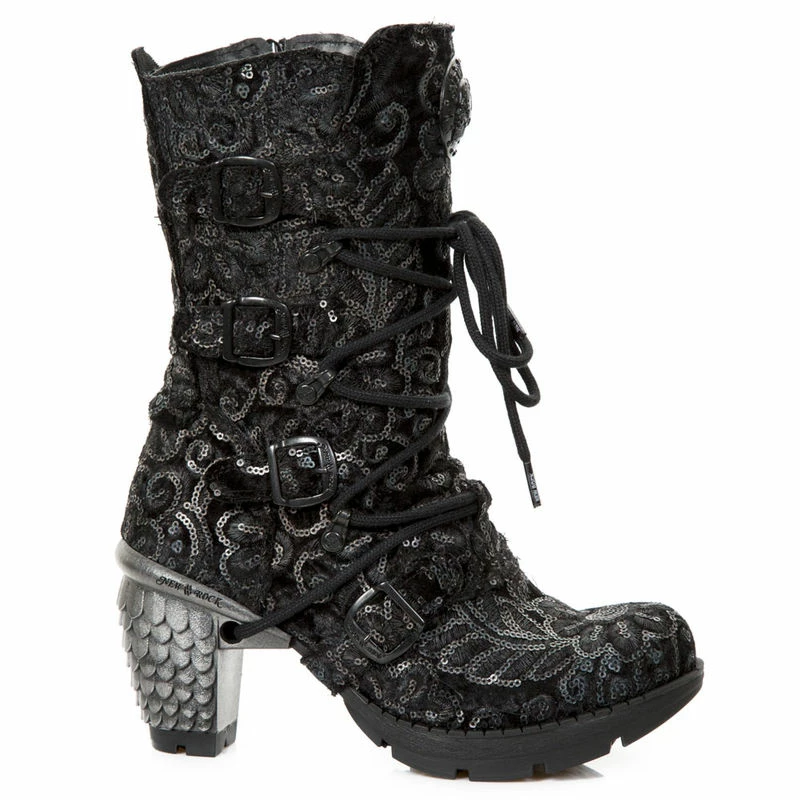 Sublimes bottes montantes à lacets New Rock. Entièrement faites de cuir, ces bottes sont ornées de motifs floraux paillettés. Mais toute l’originalité de cette chaussure ne réside pas que dans les strass, mais aussi dans ce talon métallique, emblématique de la marque, qui est de plus orné d’écailles de poisson en métal également. Bien qu’elles soient à lacets, ces bottes peuvent se mettre et s’enlever avec la plus grande facilité grâce à une fermeture éclair disposée sur le côté intérieur.