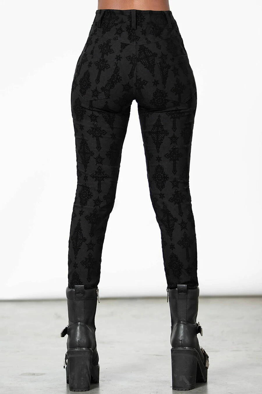 Le tissu est floqué de croix gothiques et motifs baroques en velours pour un pur look goth
