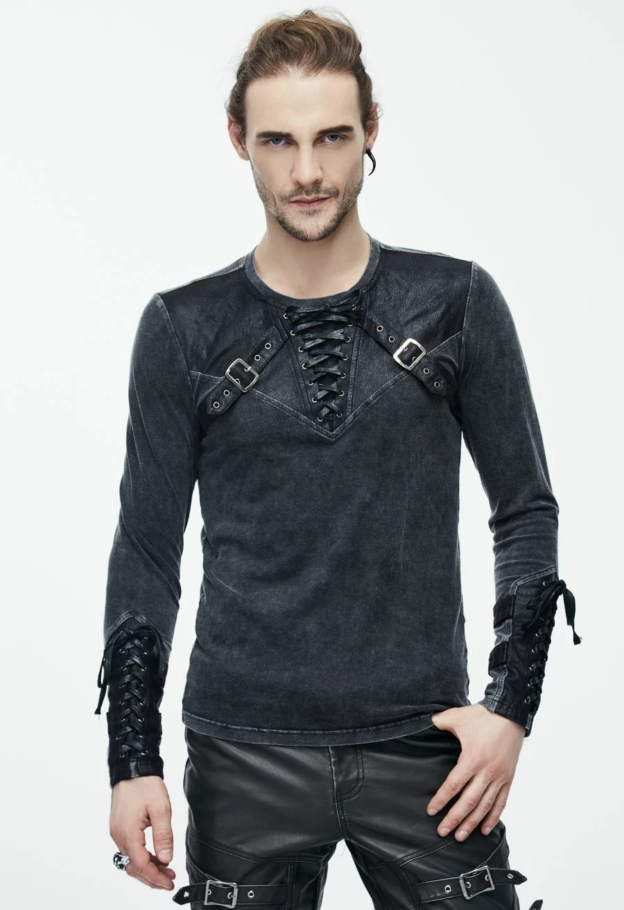 Pull gothique homme col rond en tissu léger gris anthracite, il est agrémenté de pièces de simili cuir noir et de laçages aux manches et au niveau de la poitrine