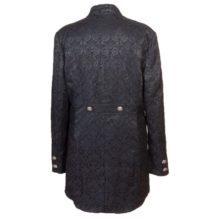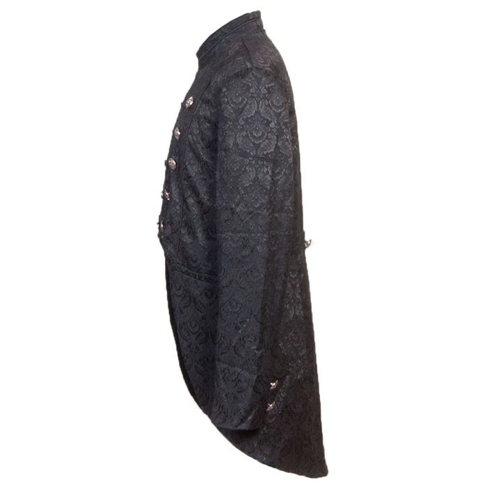Belle redingote victorienne en tissu brocarde noir, elle possède de gros boutons de décoration baroque, 2 poches à l’avant.