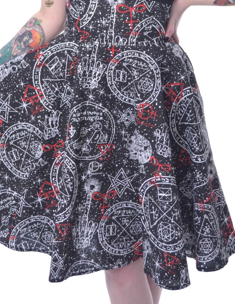 Elle possède un suiperbe imprimé sur le bas comportant des motifs ésotériques, des skulls, des pentagrammes…