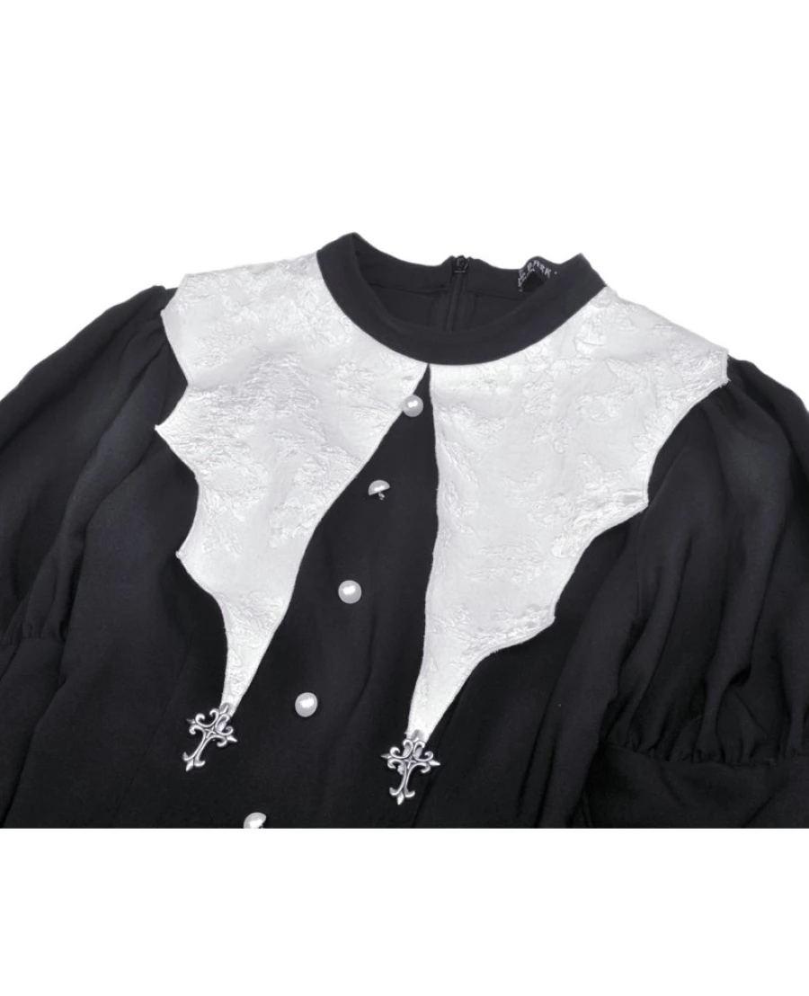 Le col et les revers de manches sont en tissu brocarde blanc contrastant à merveille avec la robe noire