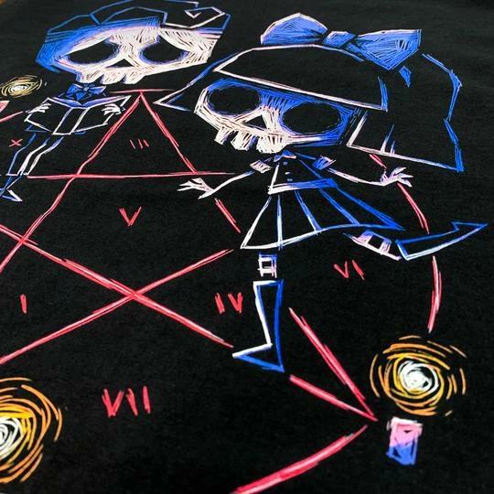 L’imprimé est terrible et porte bien son nom ‘le terrain de jeu du Diable’ avec deux squelettes dansant sur un pentagramme