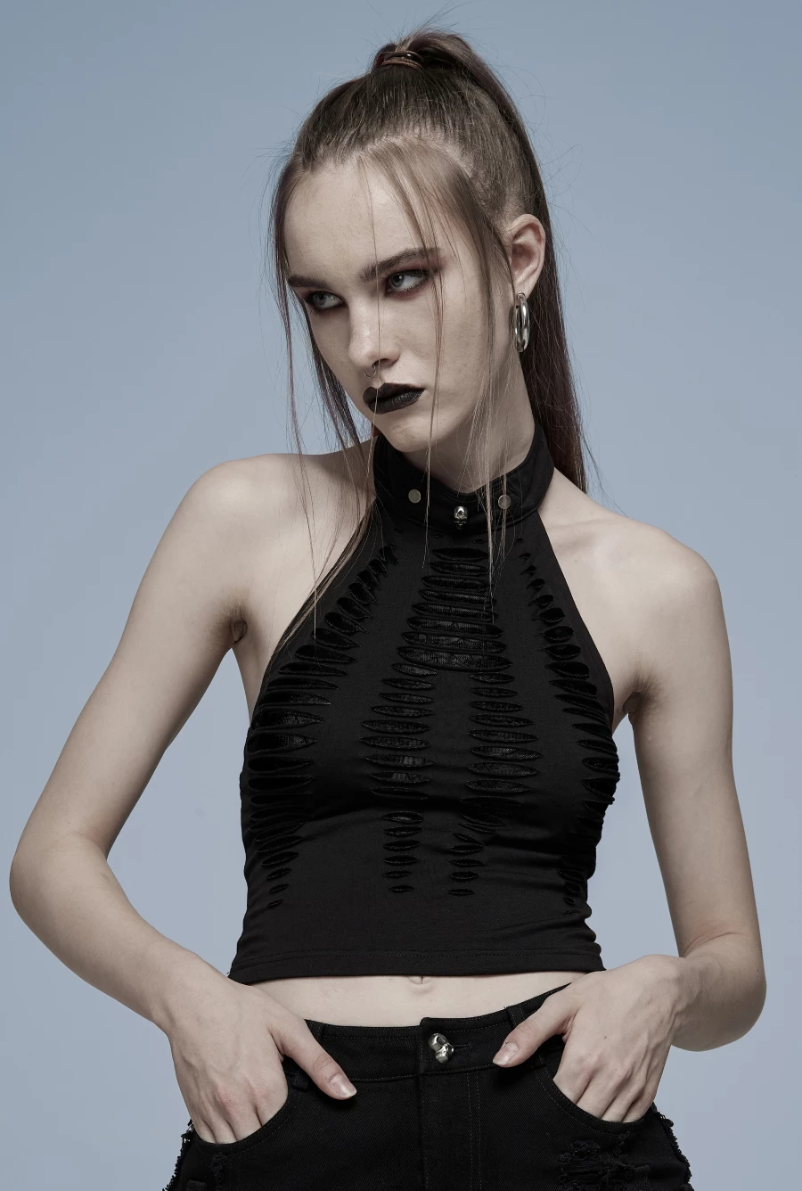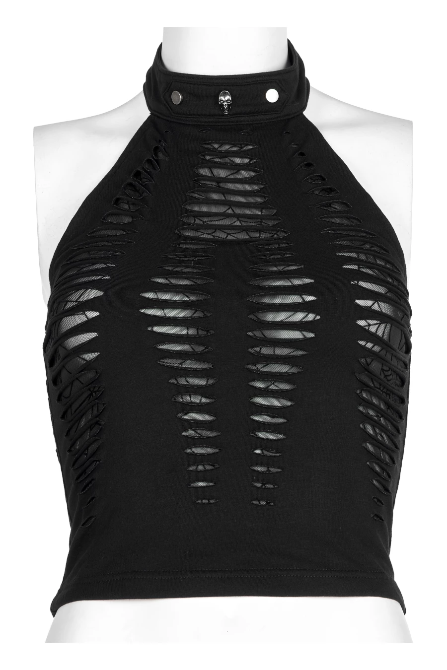 Beau top Punk Rave composé d’un tissu résille toile d’araignée recouvert d’un tissu de coton découpé
