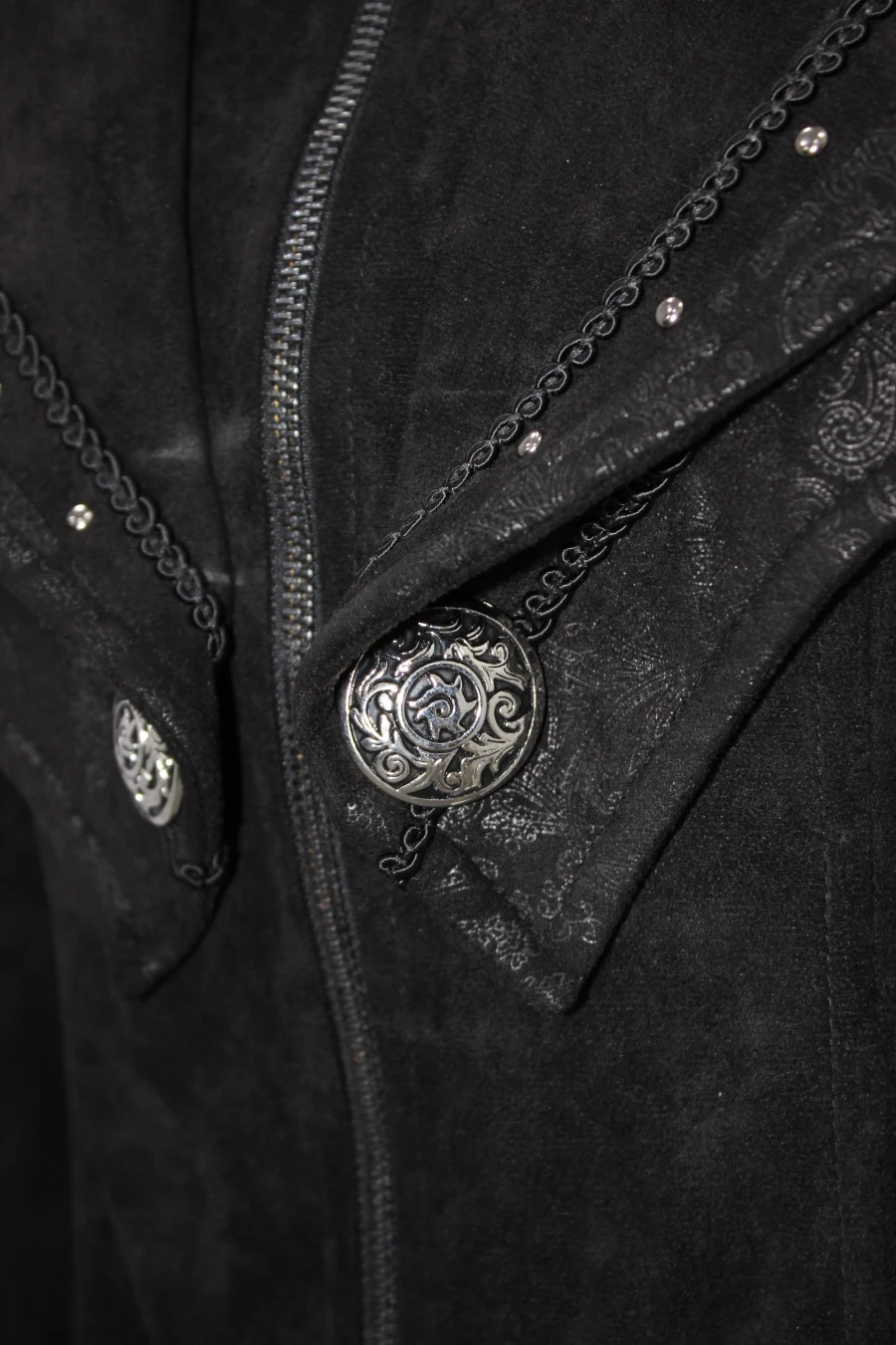 De belles broderies, de gros boutons en étain et de petits rivets viennent l’agrémenter, le résultat est splendide